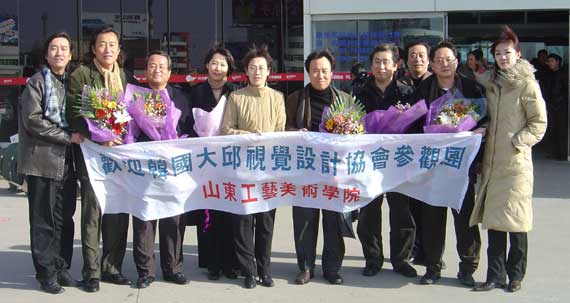 2004年1月7日韩国大邱视觉设计协会会长、善邻大学教授崔仁寿,大邱视觉设计协会总务理事、庆云大学教授池龙善,庆云大学视觉映像设计学部教授金基根,大邱法学院教授金钟鸣,善邻大学视觉情报设计系讲师金淑熙及著名的文化使者何传乾先生一行六人抵达济南国际机场。山东工艺美院李新副院长,装潢系苗登宇主任,赵进主任等前往机场迎接。
