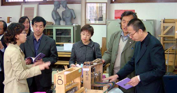 院长一行在艺术学院主任玄文哲教授的陪同下考察了该院的教授、讲师办公室和学生上课情况,与部分教授和教师进行了交流。艺术学院有工艺、东洋画、西洋画和设计四个系。其中,工艺有染织、陶瓷、实用产品设计等专业,设计有装潢、舞台艺术设计、环境设计和室内设计等专业。工艺系的教学比较有特色。一是一年级学生进行专业基础理论学习,二、三、四年级进入实习教室或教授工作室,同时进行实践操作,不同年级的学生可以互相交流,高年级的学生可以指导低年级学生。二是教学特别重视艺术与技能的结合,突出动手能力,各个专业都配备技能学习所需的设备,如材料课学生在简单机床上了解不同材料的性能和艺术效果,编织课在小型织机上进行手工编织,染色课在小模特身上用小块韩纸经某种天然液体浸泡后贴到模特身上,再涂上染料,待晒干后从后面剪开,就做成一件立体服装,非常直观。三是专业直接面向社会,特别是实用产品设计内容非常丰富,有产品开发、产品研究及产品设计与制作,不仅限于韩国,而且研究制作欧洲各国、美国、日本、中国等国家的实用产品,有木头、金属、线布等不同材质。另外,艺术学院及所考察的其他艺术院校一样,教室都很大,走廊很宽,两边统一摆放供学生使用的壁橱。这些经验我院在新校区建设中都可借鉴。
