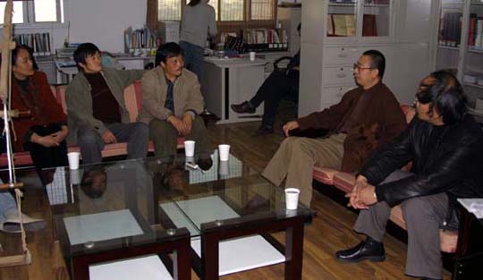 西安美院现有普通教育在校生已经达到4000余人,根据学院“十五”规划,预计“十五”末期将超过1万人。在潘院长问到学院招生人数扩张规模如此之大,如何解决师资、保证教学质量时,西安美院王院长讲到:解决问题的关键在于观念要解放,例如:西安美院用了一个“聘”字,就使“师资问题”迎刃而解。过去的老观念,如按编制进人的观念,教学、科研人才要自己培养的观念,都已经不能适应形势的发展,应该把人才管理变成活的、流动式的管理。通过开放的政策把各地的人才吸引过来,打个比方说就是“搭建起舞台,无论是哪里的名角都可以来唱戏”。西安美院现有外聘教师260余人,而在编教师只有200人左右。另外,西安美院打破了离退休的界限,教师退休只是从编制上退下来,退休后仍然可以带研究生、设立工作室、在系里代课等。