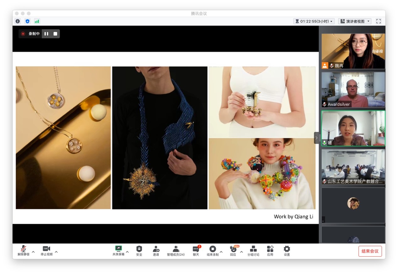 6月2日,青岛基地时尚设计学院《时尚配饰设计》中外联合课程外方授课启动,澳大利亚资深高级银奖首饰艺术家Adrian Ward夫妇受邀线上为学生讲授“当代首饰——时尚与艺术的碰撞”的专题。课程中方教师魏冉全程参与。