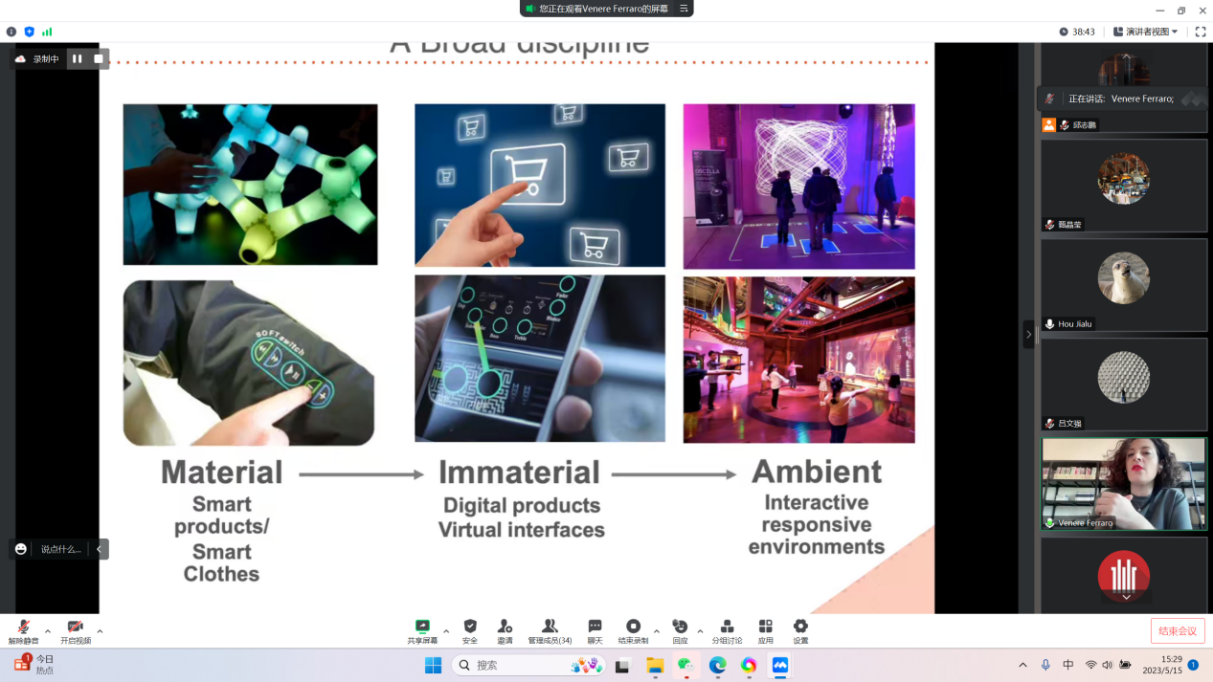 在研究生处和国际交流合作处的组织和协助下,5月15日下午,由美术馆馆长、产品系统设计工作室负责人、研究生导师林宇峰担任主讲的《产品交互行为设计与研究》课程邀请米兰理工大学费拉罗·维纳瑞(Venere Ferraro)教授为2021级工业设计、家居设计、展示设计专业硕士生讲授“交互 • 行为 • 产品”专题讲座。