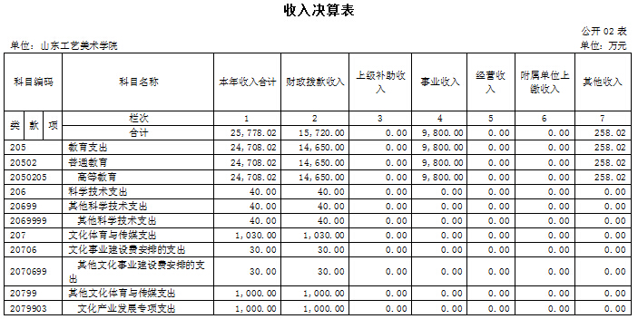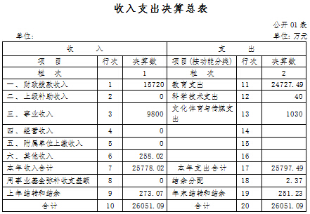 一、收入支出决算总体情况 2014年度收入总计 26051.09万元,其中:财政拨款收入 15720万元,事业收入9800万元,其他收入258.02万元,年初结转和结余273.07万元。 2014年度支出总计 26051.09 万元,其中:教育支出24727.49万元,科学技术支出40万元,文化体育与传媒支出1030万元。 二、一般公共预算财政拨款支出决算情况 2014年度一般公共预算财政拨款支出决算为15711.84 万元,具体情况如下: 1、教育支出14671.84万元,主要用于高等教育。 2、科学技术支出40万元,主要用于其他科学技术支出40万元。 3. 文化体育与传媒支出1000万元,主要用于文化产业发展专项支出。 三、政府性基金预算财政拨款收入支出决算情况 2014年政府性基金预算财政拨款年初结转和结余0万元,本年收入30万元,本年支出 30万元,年末结转和结余 0万元。 2014年政府性基金支出决算为 30万元,具体情况如下: 文化体育与传媒安排的支出 30万元,主要用于其他文化事业建设费安排的支出。 四、一般公共预算财政拨款“三公”经费支出决算情况 无 五、政府采购支出情况 2014年2025新澳门免费原料大全政府采购支出总额958.84万元,其中:政府采购货物支出583.22万元、政府采购工程支出375.62万元、政府采购服务支出0万元。