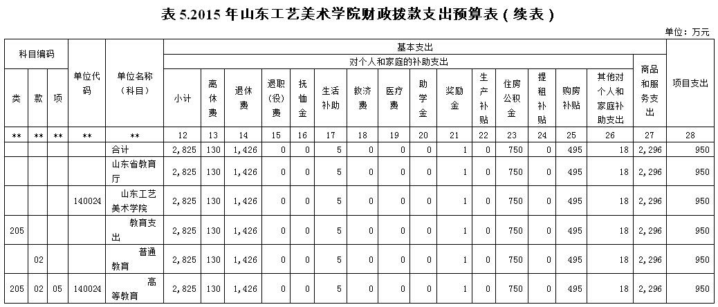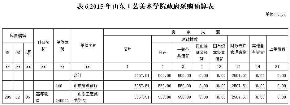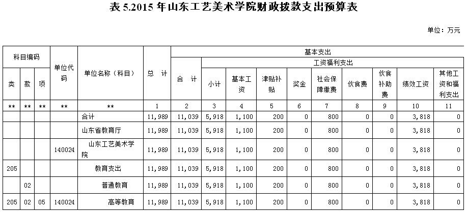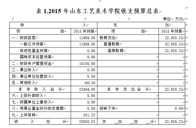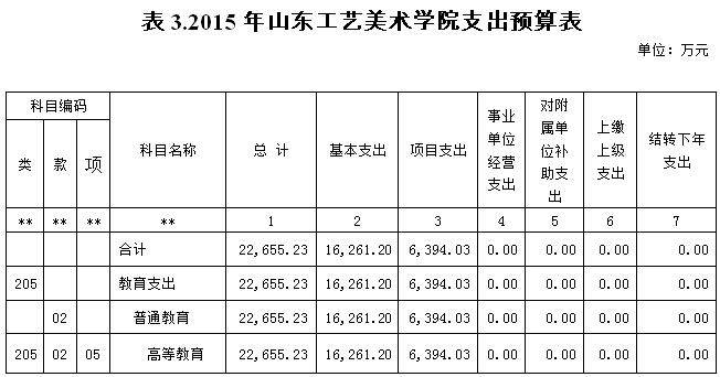 一、预算编制的基本原则和方法 2015年预算编制遵循的原则:一是加强财务管理,强化预算约束力,在保障学校日常运转的基础上,从紧安排各项支出;二是编实、编准、编细各项收支预算,量入为出,量力而行,不搞赤字预算;三是保证重点项目,突出当年学校重点建设项目的中心地位,保证对教学、科研的投入;四是开源节流并重,加快预算执行进度,适当筹集资金,减少欠款,节约各项开支,提高资金使用效益。预算采用零基预算的方法编制。 二、收支预算总体情况 2015年收入预算为22404万元,其中财政拨款11989万元,财政专户管理资金10150万元,其他收入265万元。上年结转251.23万元。 2015年支出预算为22655.23万元,均为教育支出。 三、财政拨款支出预算情况 2015年财政拨款支出预算为11989万元,均为教育支出普通教育支出,主要用于工资福利支出、对个人和家庭的补助支出、商品和服务支出和项目支出。 四、学校一般公共预算财政拨款“三公”经费支出预算为零。