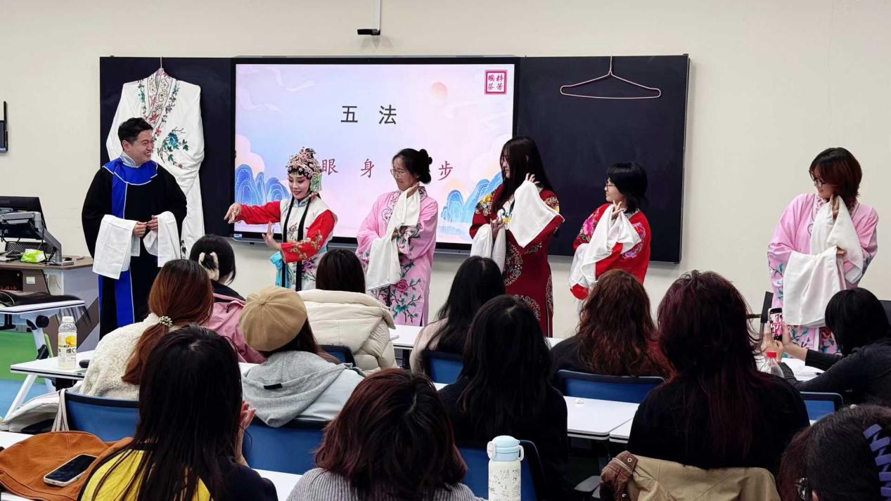 山东省京剧院青年演员魏圣雪、崔敬强以系统性的艺术导览方式,为在场学生构建了一幅关于京剧艺术形态与表现体系的完整图景。其讲解过程体现出鲜明的结构性特征,从京剧形成的历史语境出发,溯源“徽班进京”的文化融合背景,阐释京剧在吸收徽剧、汉调、秦腔、昆曲等多种地方戏曲元素过程中所形成的艺术范式与美学原则,从而确立其作为民族戏剧典范的“国粹”地位。