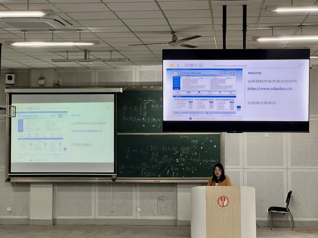 会上,高畅老师就大家关心的就业、毕业手续办理等做了详细介绍,帮助同学们厘清毕业离校前需要完成的各项工作,引导同学们做到毕业就业两手抓;重点针对网上签约与山东高校毕业生就业信息网的使用展开培训;再次强调校园安全和就业安全等事项,叮嘱同学们一方面要严格遵守学校管理规定,另一方面在积极求职的同时要保障好个人权益,切实增强防诈骗意识。