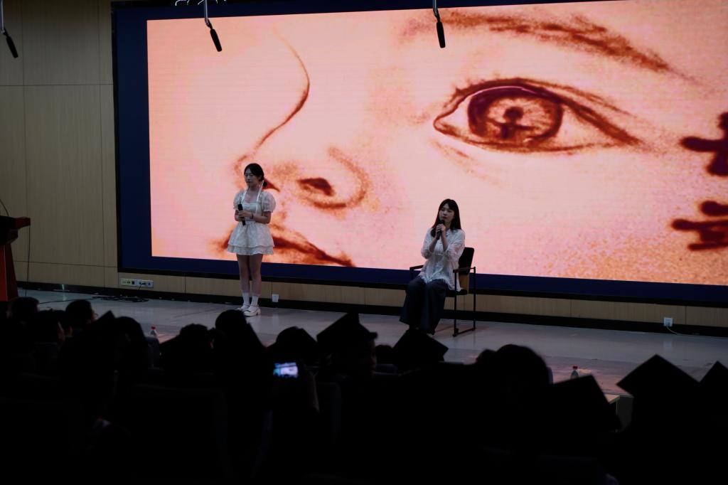 毕业学子用歌声致敬青春,展现蓬勃青春力量。毕业生赵英贺、崔慧、宋佳音分别为大家带来了歌曲《入海》、《是妈妈是女儿》,为毕业典礼掀起又一个高潮,唱出了即将毕业的学子对母校的无限眷恋,以及对师友浓浓的不舍之情。