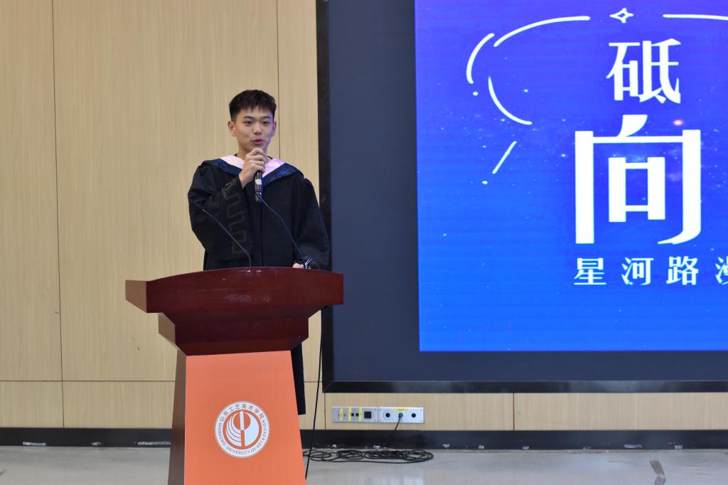 毕业生代表王浩然上台发言,回顾四年充实美好的大学生活,他代表全体毕业生对母校、老师、同学以及亲友致以诚挚的感谢和感恩。并表示作为新时代的青年学子,有责任肩负起新时代的重任,不负时代,不负韶华,成为新时代奋勇前进的开拓者,砥砺前行,以青春之名,赴时代之约。