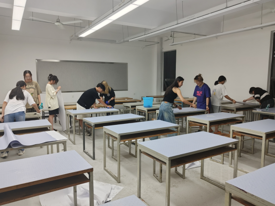 开学前,同学们对全部教室进行卫生打扫和环境美化。所有同学齐心参与,将每张课桌细心粘贴上桌面贴纸,为新学期开学营造干净、整洁、舒适的学习环境。