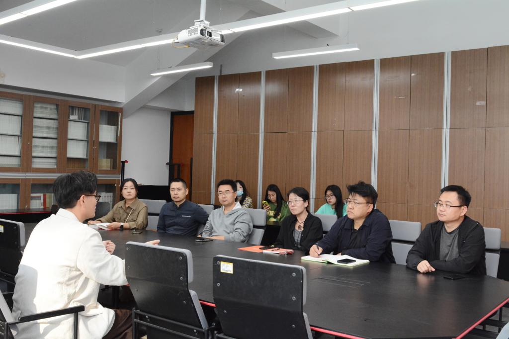 讲座前,视觉传达设计学院院长王晓峰,党总支书记林波,副院长张培源,教师王刚、杜明星、姜晓慧、高蓬就学科建设、人才培养、授课模式、科研创作等与蔡文超进行了座谈交流。王晓峰首先向蔡文超介绍了学院的办学理念与特色、人才培养、专业建设等基本情况,蔡文超对学院的学科建设表达了高度认可,并详细介绍了中国美术学院创新设计学院的办学理念、师资团队、教学过程、成果呈现等情况。双方希望以本次讲座为契机,加强艺术院校之间的交流与合作,共同探索设计艺术教育创新发展路径。
