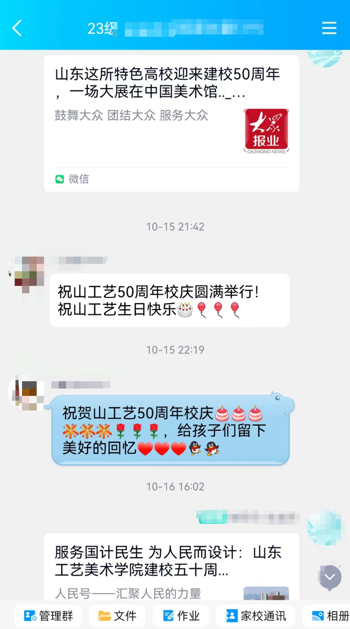 视觉传达设计学院建立家校联动机制,深化家校协同育人。在2023级新生开学报到时举办新生家长见面会,在建校五十周年校庆之际向家长介绍学校发展成就,让家长更加了解认识学校。在日常学生教育管理服务过程中,就学生医保、学费缴纳、离校确认、学生安全等重要事项,通过班级家长qq群、点对点沟通、面对面交流,密切家校联系,促进老师、家长、学生之间良好互动,共同帮助学生成长。