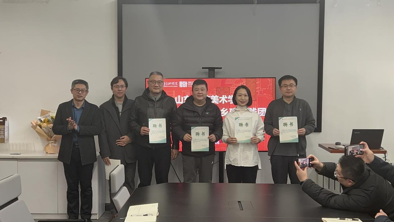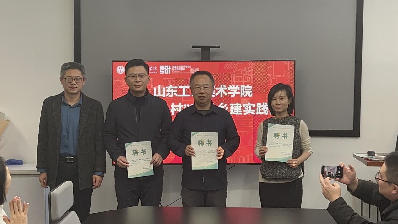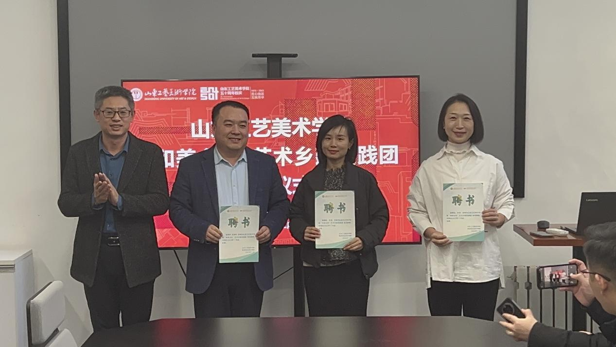 主持人公布了实践团导师团队名单,包括继续教育学院党总支书记、院长吴焕文,人文艺术学院副教授刘娅萍,继续教育学院教师路鹏、李霞,视觉传达设计学院资深教师曲展、张瑞、朱小杰、杜明星、李海峰、徐德记,济南市农业产业协会执行秘书长张朝钧,山东智锐信息科技有限公司总经理蒋宝柱,山东西城时光文化投资有限公司副总经理葛琳等。校团委书记王军强为“和美乡村”艺术乡建实践团指导教师颁发了聘书。