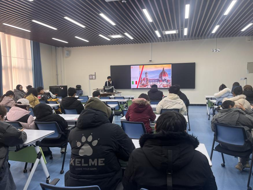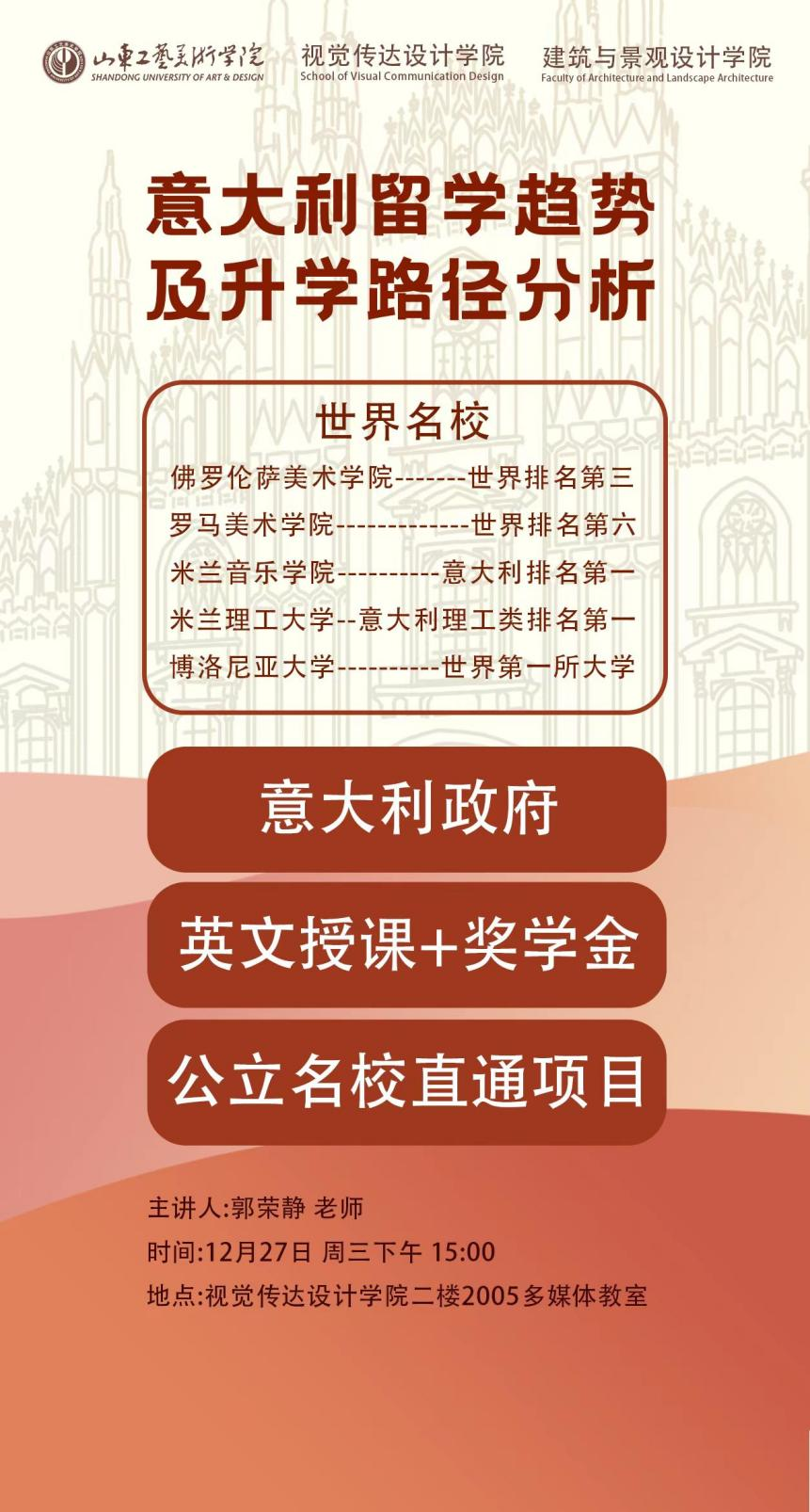 为帮助学生提前做好就业规划,给学生提供更丰富的升学路径,满足学生的发展需求,促进学生做好自己的学习生涯规划和选择,普及留学知识,拓宽国际视野,12月27日下午,视觉传达设计学院与建筑与景观设计学院于视觉2005多媒体教室联合举办意大利留学趋势及升学路径分析讲座。中睿意博文化创意(山东)有限公司郭荣静老师担任主讲人。毕业班辅导员高畅、韩晓旭参加讲座。