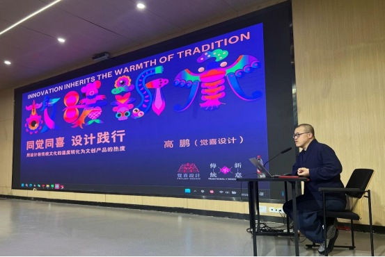 讲座开篇由高鹏教授用山西当地建筑龙头砖雕和龙柱制作的文创产品抛砖引玉带入主题“故暖新承”。“故暖新承”既“古意新潮”,“古意”与“新潮”不矛盾,解释传统不是过时,是经典和传承,是永不褪色的价值,是一个时代趋势的映照。并用虎头鞋与奢侈品鞋的价值差距引发观者思考。