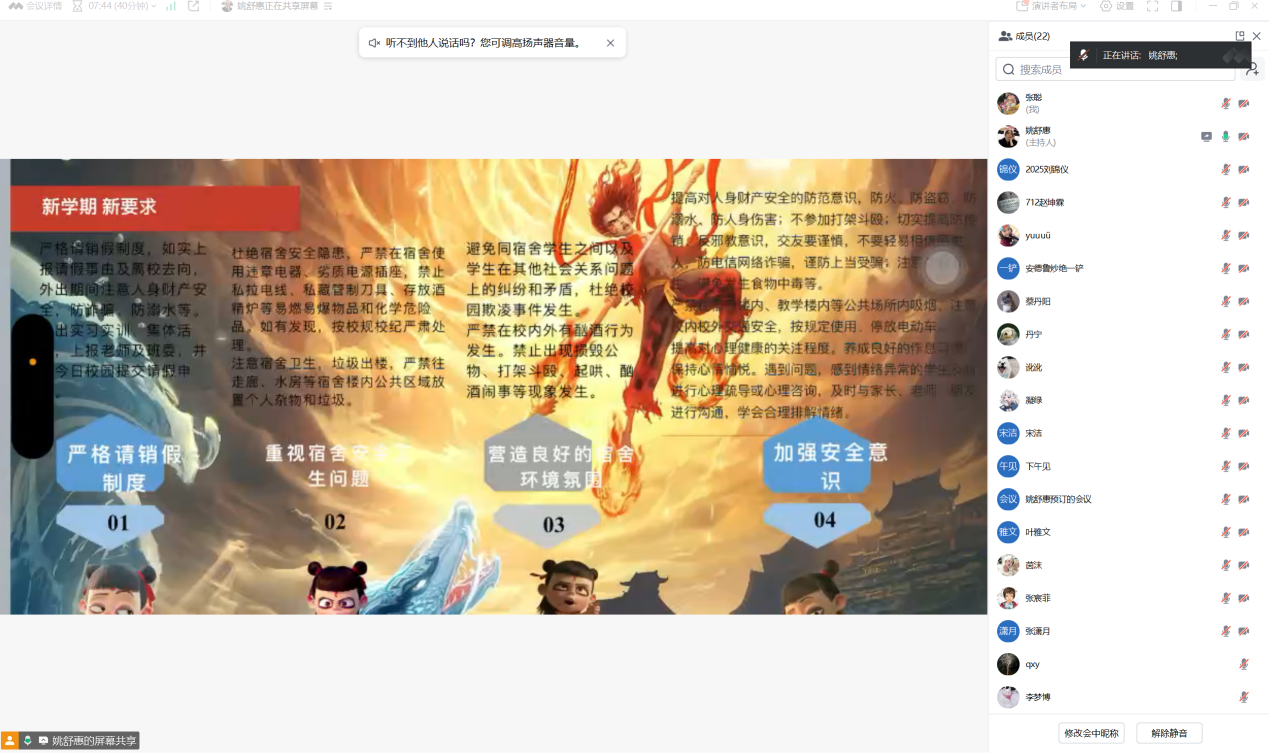 随后,班会聚焦于入学安全教育。从学业规划与要求,到国家安全、生命安全、消防安全等多个维度,进行了全面深入的讲解。着重强调了人身安全、财产安全、交通安全等方面的注意事项,同时对心理健康、反诈防骗以及宿舍安全卫生等内容进行了细致阐述,旨在强化学生的安全意识,提升自我保护能力,共同维护和谐稳定的校园环境。班会最后,明确指出了各年级在开学后的注意事项和纪律要求,敦促学生们尽快调整作息,严格遵守课堂纪律,以良好的精神风貌投入到新学期的学习生活中。