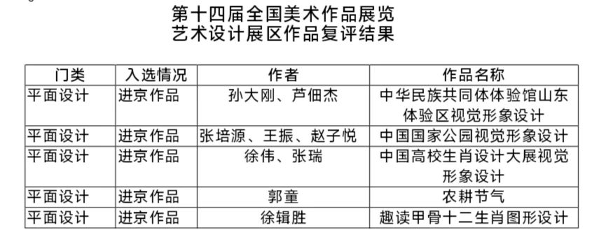 孙大刚、芦佃杰的作品《中华民族共同体体验馆山东体验区视觉形象设计》;张培源、王振、赵子悦的作品《中国国家公园视觉形象设计》;徐伟、张瑞的作品《中国高校生肖设计大展视觉形象设计》;郭童的作品《农耕节气》;徐辑胜的作品《趣读甲骨十二生肖图形设计》成功入选。