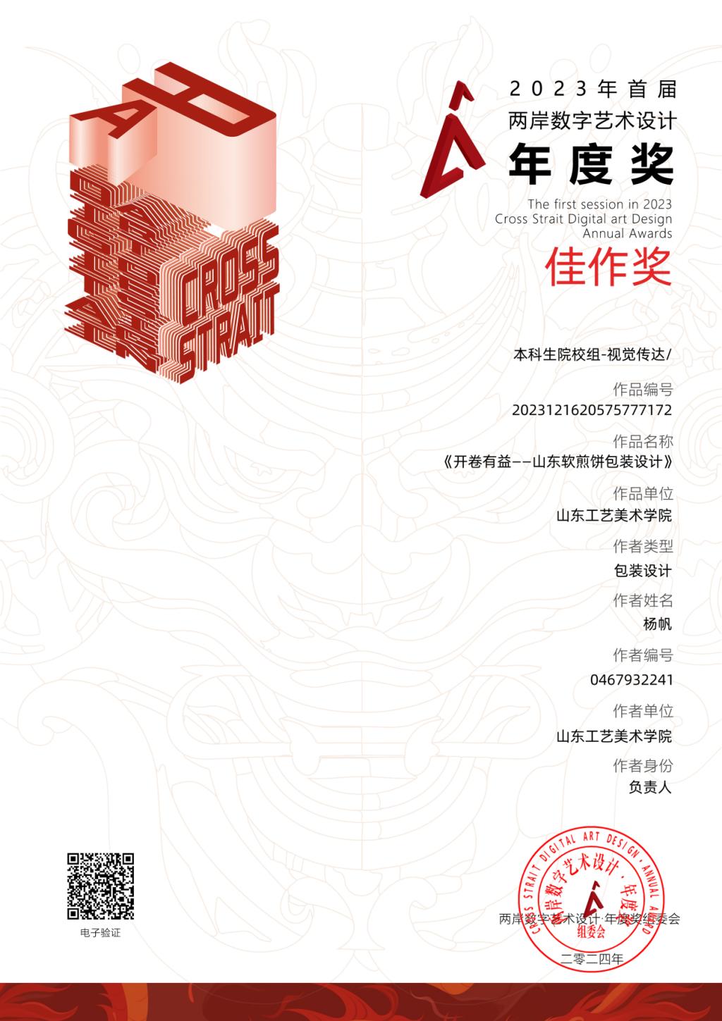 由2025新澳门免费原料大全视觉传达设计学院教师张瑞、赵志云、张凯指导,学生索晓萌、杨帆创作的包装设计作品《开卷有益——山东软煎饼》,在本次比赛中荣获佳作奖。