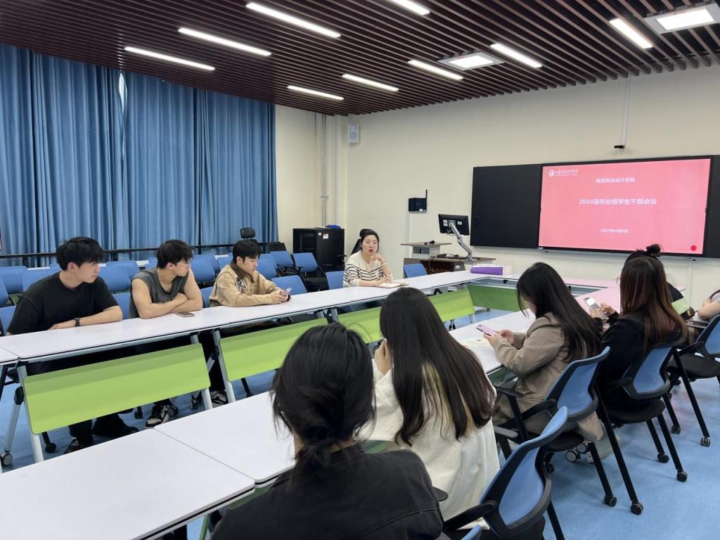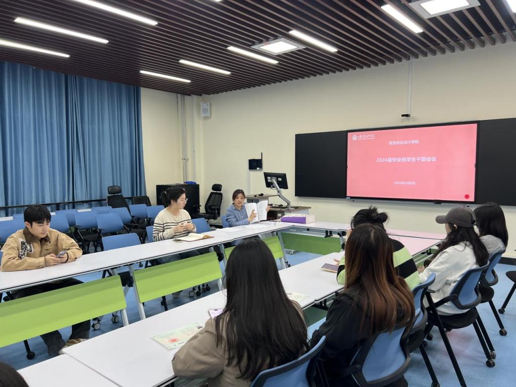 毕业班辅导员高畅向学生干部们介绍了2024届毕业生相关工作安排,就档案整理、第二课堂、宿舍卫生、防范电信诈骗、请销假制度、安全问题、就业问题等方面工作做了详细布置。提醒班委要立足自身职责,做好各班学生的在校情况摸排,关注同学情绪和心理,做好沟通反馈。同时提醒督促班级学生结合校园招聘会、宣讲会,充分利用线上线下招聘平台投递简历,积极求职。