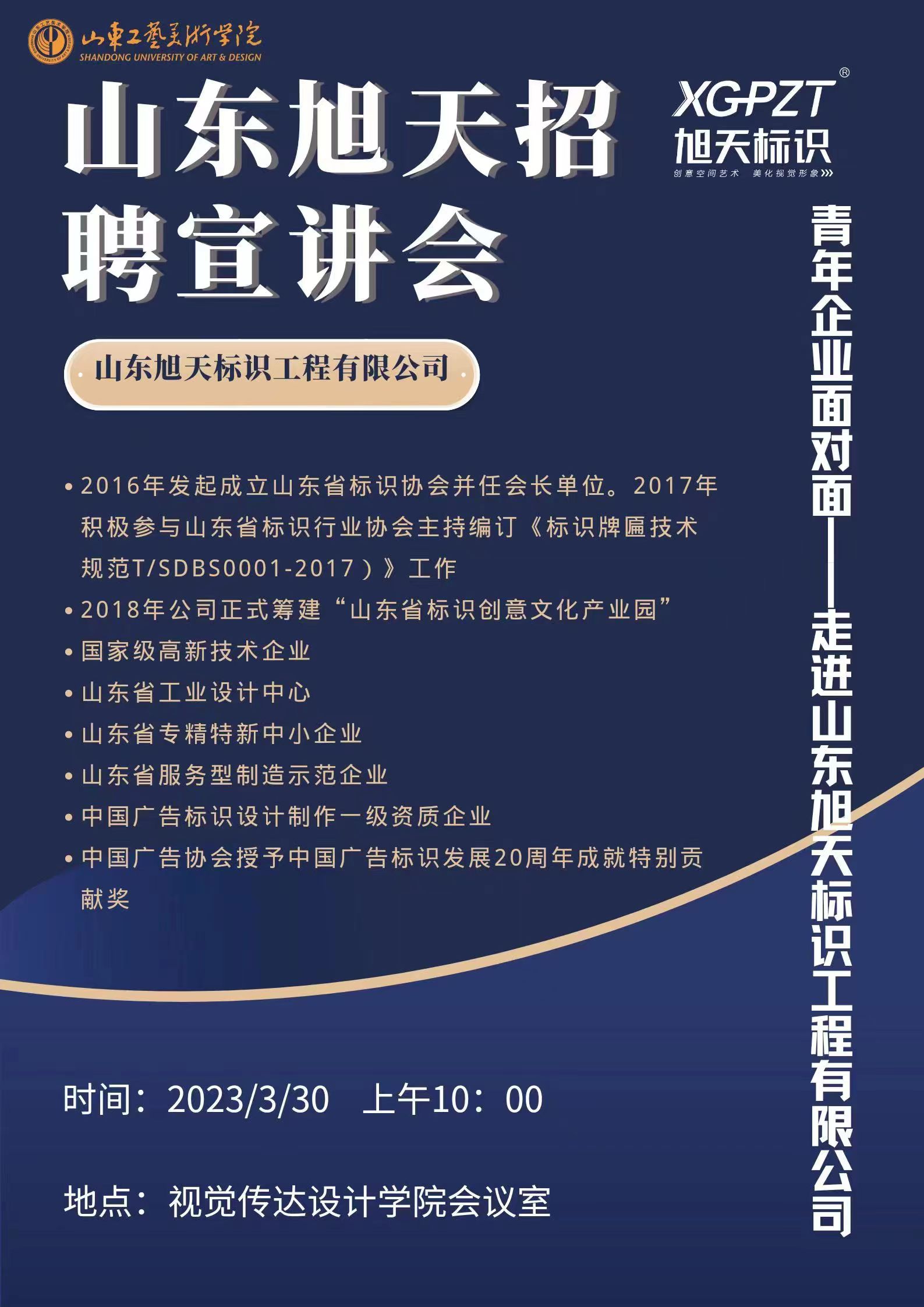 为帮助2023届毕业生掌握就业形势,搭建就业桥梁,3月30日上午,视觉传达设计学院于学院会议室举办了山东旭天标识工程有限公司专场招聘宣讲会。本次招聘宣讲会由山东旭天标识工程有限公司设计总监钱磊担任主讲。