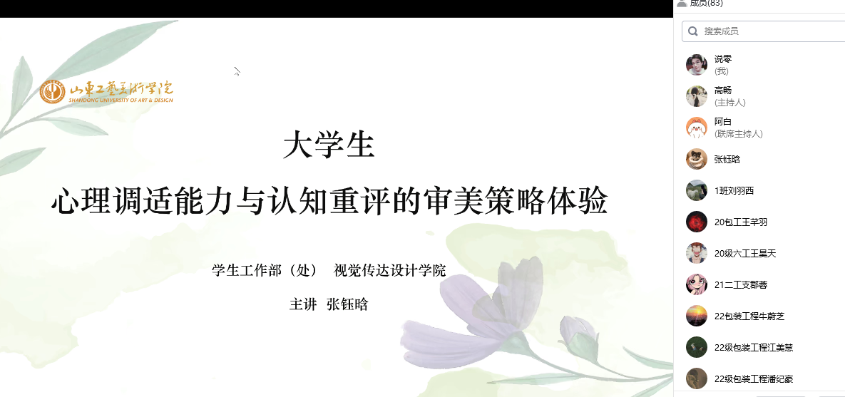 12月22日,学生工作部(处)、视觉传达设计学院联合举办了“心理赋能”素质教育专题线上讲座,邀请学生工作部(处)张钰晗以《大学生心理调适能力与认知重评的审美策略体验》为主题,对学生进行心理健康知识培训,开展心理援助,为学生提供暖心服务。