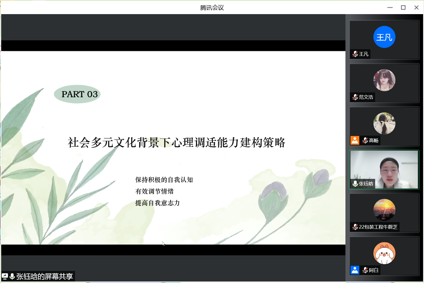 张钰晗以融合心理健康、审美体验的概念入题,对心理调适能力、认知重评、审美体验进行详尽解读。对建构自我心理调适能力的内因、外因;社会多元文化背景下心理调适能力建构策略;心理调适能力与审美体验的建构意义进行了详细阐述。同时提出了社会多元文化背景下心理调试能力建构与审美体验策略的三个着力点,即保持积极的自我认知、有效调节自我情绪、提高自我意志力。讲座中融合生动有趣的案例小剧场,加深了同学们对合理运用心理调适能力与审美策略体验的理解。