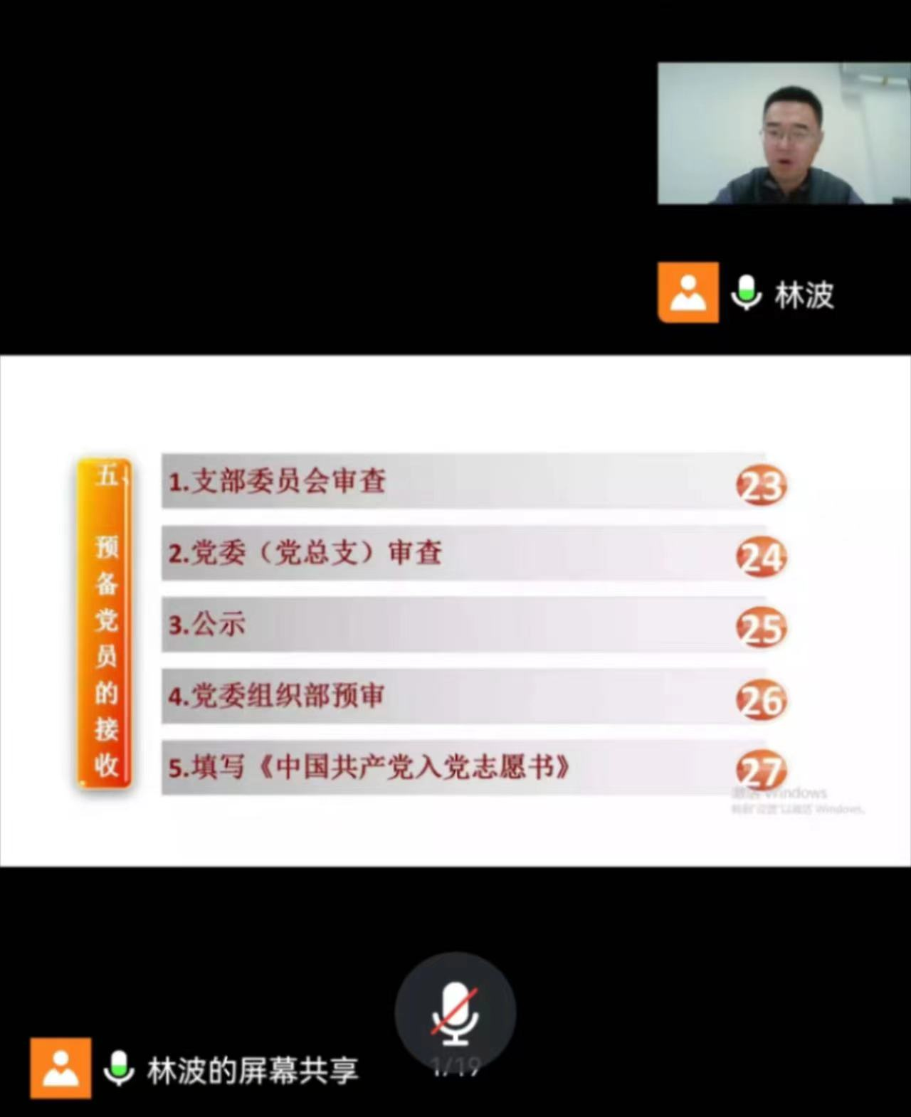 10月20日晚,党总支书记林波通过腾讯会议以线上形式,以“坚定信仰信念 不负青春韶华”为主题,为新生举办入党启蒙教育讲座。林波从“为何要申请入党”、“申请入党的基本条件和流程”、“如何以实际行动早日入党”等三个方面展开,并对学生的学习与生活提出了建议和要求。