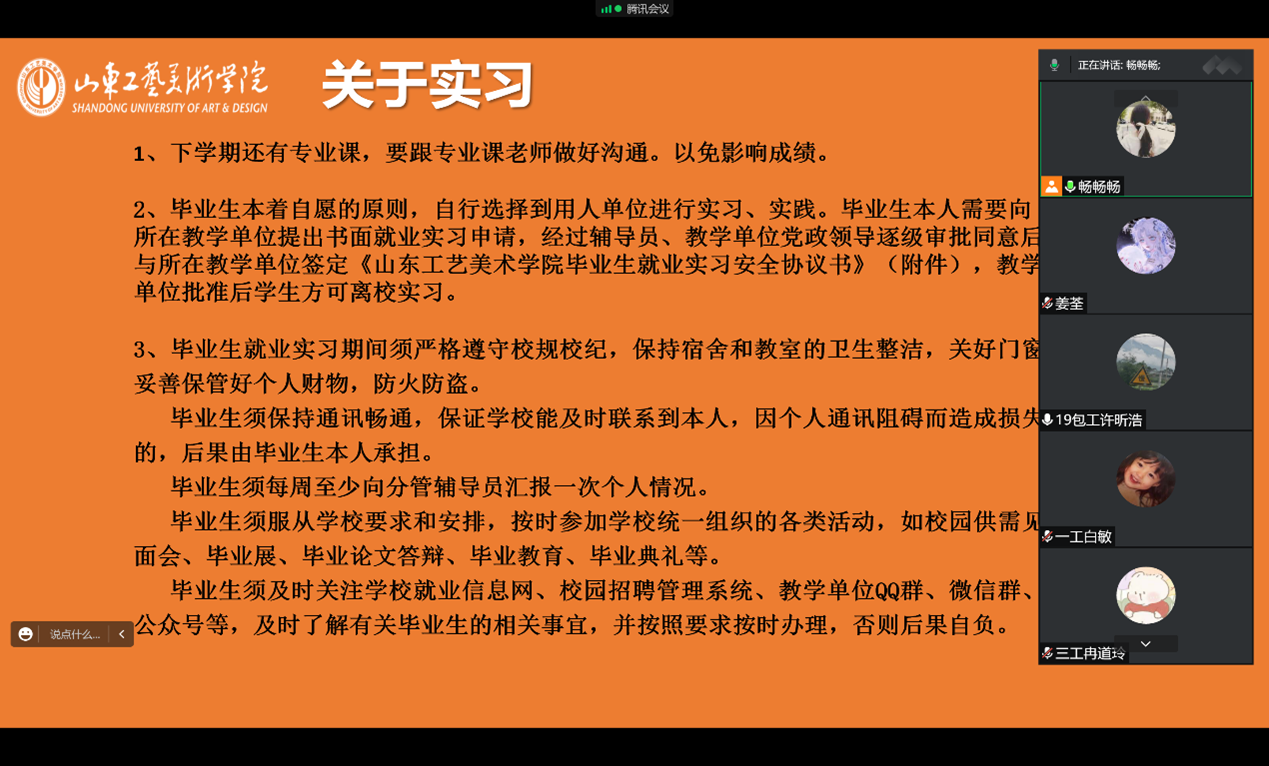 辅导员高畅首先强调了暑期疫情防控要求、离校安全、交通安全、出行安全、饮食安全和求职安全等方面的安全问题,帮助同学们增强安全意识,提高防范能力,做到防溺水、防事故、防诈骗、防传销等。然后,告知同学们新学期安排,要求同学们按时到校报到,做好与家长、老师、同学之间的沟通交流。最后,为同学们解读《2025新澳门免费原料大全毕业生就业实习管理办法》,要求同学们按照学校有关要求进行就业实习。