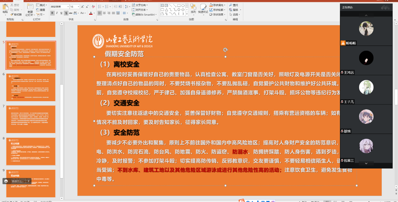 6月22日,为落实学校关于认真做好暑期学生安全和新学期开学报到工作的要求部署,做好学生暑假期间新冠肺炎疫情防控、校园安全稳定、暑期安全教育工作,保证学生假期安全,视觉传达设计学院分别召开2020级、2021级线上暑期安全教育大会。会议分别由视觉传达设计学院辅导员高畅、陈瑶主持。
