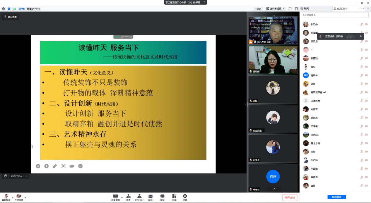 4月19日晚,为传承和弘扬优秀传统文化,增强文化自信,提高我院师生专业素养,提升设计水平,视觉传达设计学院邀请徐思民教授举办《读懂昨天,服务当下——传统纹饰的文化意义及时代应用》专题云讲座。院长王晓峰主持讲座。