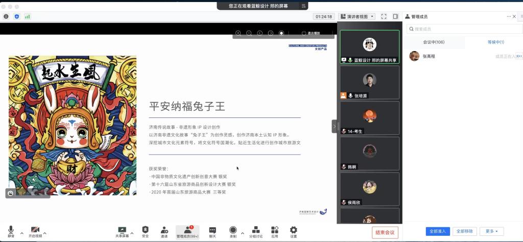 活动中,各企业根据招聘安排,分时段与参会学生开展互动,依次进行企业宣讲、岗位介绍、招聘需求,并结合公司设计实例与参会同学开展互动。其中,蓝鲸艺术设计公司,本次招聘会主招平面设计师、IP设计师,希望应聘者审美标准高、有责任心、有扎实的基础知识、较好的工作能力;乘果广告集团提供了初级动画师、初级插画师、初级平面设计师三类岗位,30余人的需求;红霖视觉设计山东有限公司拟招聘品牌包装设计师8名,商业插画师3名,并承诺入职后会有五险一金、下午茶、各类团建等福利政策。