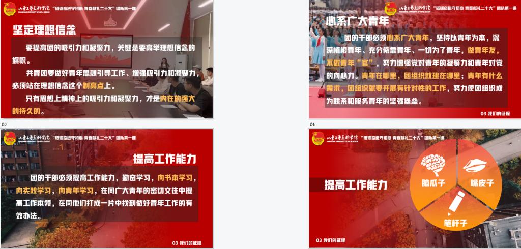 2022 年是党的二十大召开之年,是中国共产主义青年团建团 100 周年。为深入学习贯彻党的十九大和十九届历次全会精神,贯彻落实习近平总书记关于青年工作的重要思想,持续巩固深化拓展党史学习教育成果,教育引导广大团员青年坚定不移听党话、跟党走,庆祝建团100 周年,以奋发向上的精神状态迎接党的二十大胜利召开,3月21日至4月10日间,视觉传达设计学院团总支、各团支部以线上形式开展“砥砺奋进守初心 青春献礼二十大”团队第一课。