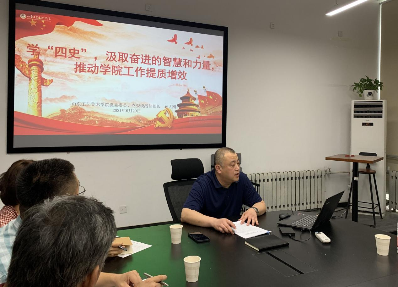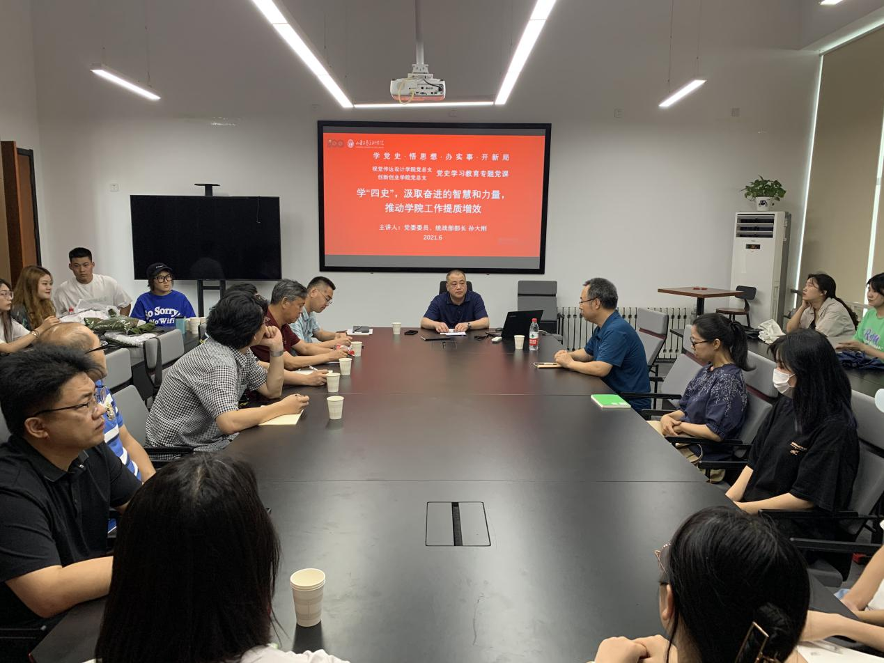 6月29日上午,党委委员、统战部部长孙大刚以《学“四史”,汲取奋进的智慧和力量,推动学院工作提质增效》为题,讲授了一堂具有思想性、指导性和针对性的党史学习教育专题党课。视觉传达设计学院党总支、创新创业学院党总支全体师生党员聆听党课。