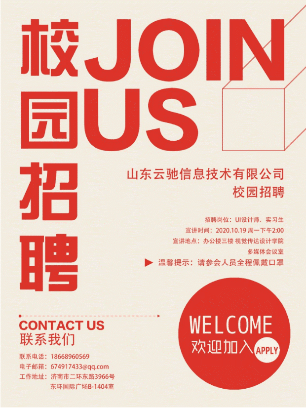2020年10月19日下午,山东云驰信息技术有限公司在视觉传达设计学院三楼多媒体会议室召开2020年校园招聘宣讲会、校园招聘会。该公司负责本年度校招的朱女士表示,公司对UI设计师、视觉设计师、插画师等职位有需求,希望应聘人员能够真心热爱设计行业,有自己的设计风格和思路,公司高度尊重原创作品。