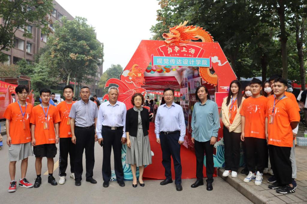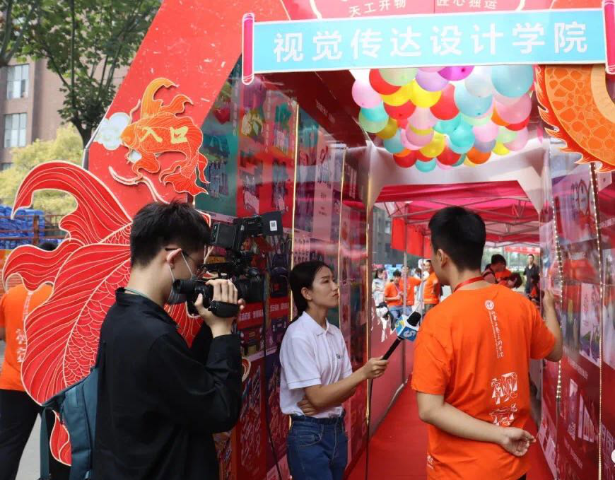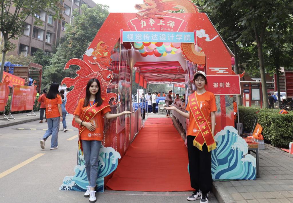 视觉传达设计学院在迎新现场开展了“时光隧道”“锦鲤跃龙门”等创意迎新活动。本院学子手工打造了近4米长的时光隧道,两侧可看到视觉传达设计学院的发展历程。隧道展示了近年来视觉师生在2008北京奥运会、第十一届全运会、上合组织青岛峰会、全国美展等重大活动取得的专业成果以及各项专业比赛中、历年毕业展中视觉学子的精彩作品。“锦鲤跃龙门”寓意祝贺新生历经苦学,跃入理想大学,在大学生活中能够学有所成、心想事成。活动使新同学充分感受到了丰富多彩的校园文化和精神风貌,帮助新生尽快融入校园生活。