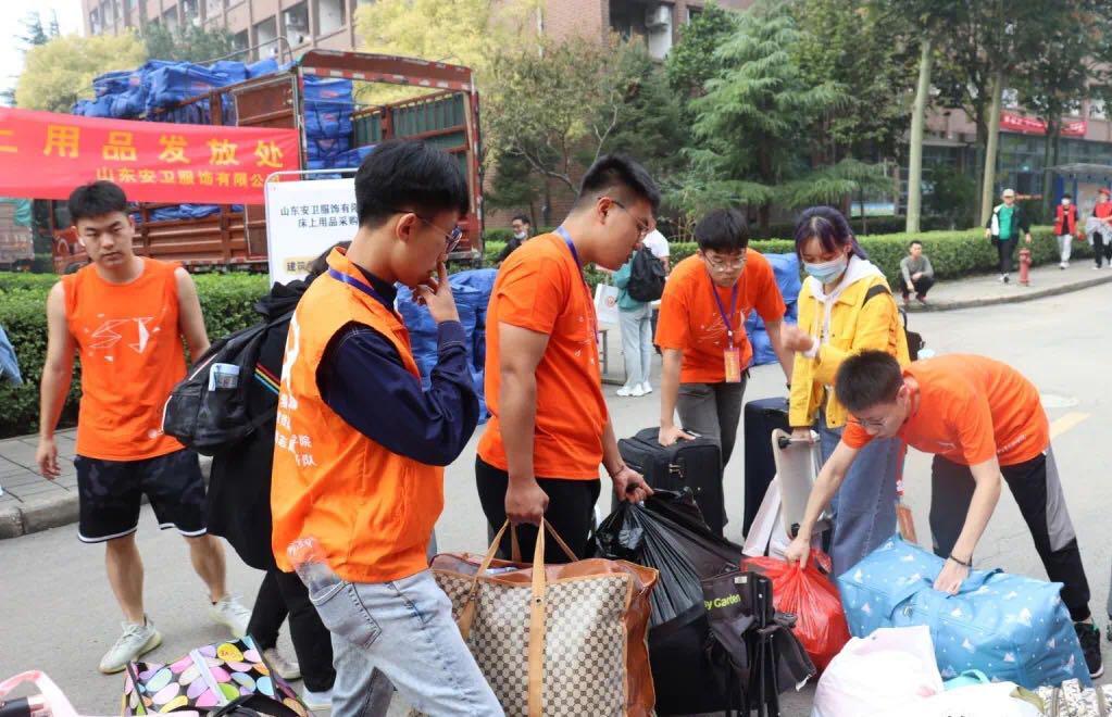 早7时,视觉传达设计学院学生会迎新志愿者们统一着装,准时集合,迎接大一新生的到来。我院在学校各处设置引导点,每个引导点都安排志愿者执勤,由他们带领新生抵达学院报到区。新生来到报到现场,志愿者们帮助新生进行线上扫码签到、学费审核、材料提交、物品发放等工作。同时,学院还专门安排了志愿者以及爱心行李车帮助新生指引宿舍,搬运行李。