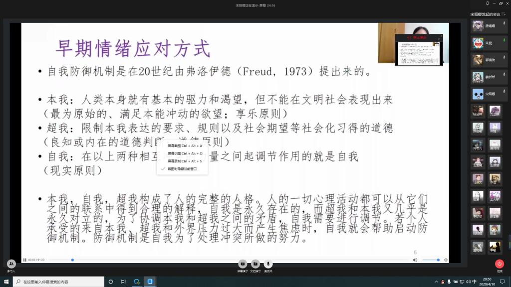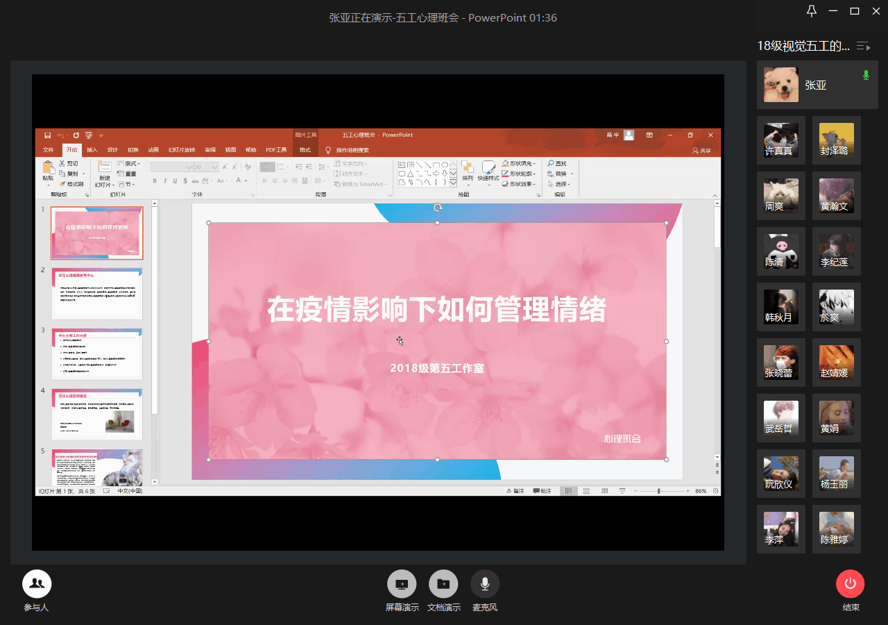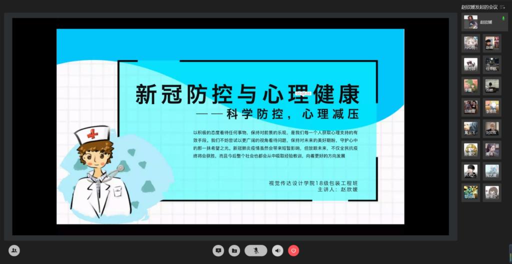 2020年4月10日,视觉传达设计学院线上召开了“在疫情影响下如何管理情绪”主题心理班会。各班通过企业微信APP线上平台,结合本次主题展开了热烈讨论。本次活动由各班心理委员主持,18、19级全体同学积极参加。