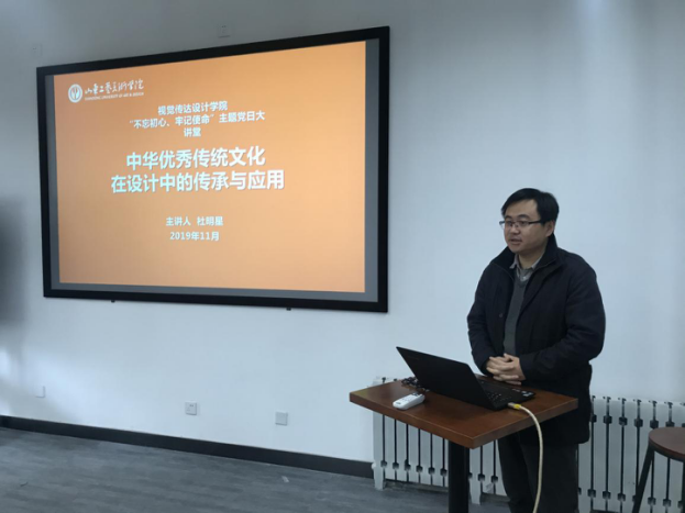 11月19日下午,视觉传达设计学院召开主题党日大讲堂活动,教工党员杜明星担任主讲,题目为《中国优秀传统文化在设计中的传承与应用》,视觉传达设计学院全体教工党员参加活动。