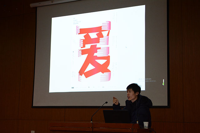 许力从自己最初参加国外设计大赛落选的经历讲起,向同学们强调执着坚持的精神的重要性。他提到自己多年来一直在坚持字体设计的研究,他表述自己与“汉字”的关系经历了“认字、读字、写字、玩字、恋字”的变化。许力老师解释“字意”包含两个方面,一是“表意”,即用形式去表达意义,二是“新意”,即用新材料新形式和新的媒介传播手段去探索字体设计与海报设计的可能性。
