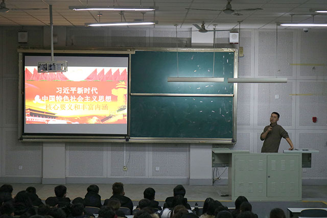为了认真学习贯彻落实十九大精神,引导广大学生不忘初心,努力成才,视觉传达设计学院团总支书记林波于2017年12月25日晚在四合堂为2017级学生作了“习近平新时代中国特色社会主义思想的核心要义和丰富内涵”主题讲座。