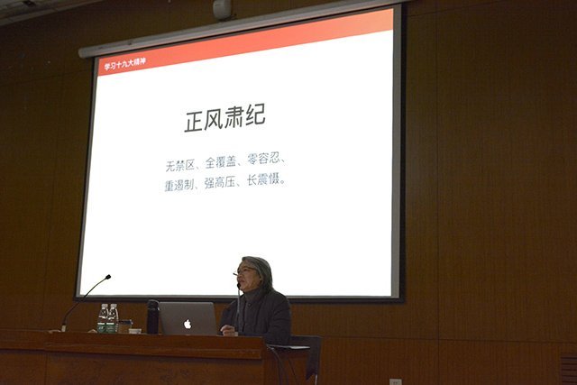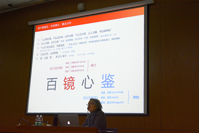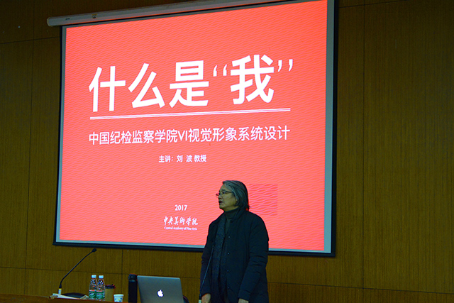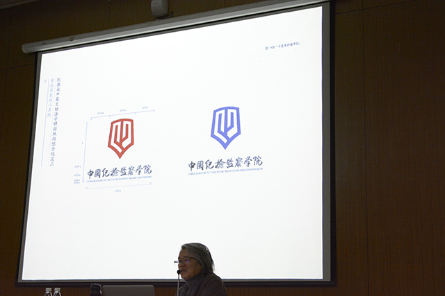 刘波教授满头银发,举手投足间体现出设计大师的风范。讲座中,刘波教授介绍了自己亲历的设计项目——中国纪检监察学院VI设计的过程:2009年5月接到中国纪检监察学院标志设计的任务,此前,从全国公开招标征集而来的2000多个设计方案,都没有被评委认可。最后,中国纪检监察学院找到刘波教授,提出设计委托要求:“这是一项艰巨的任务,全国都在反腐,作为中国纪检监察学院这样一所学校,标志必须要有威严震慑力。”