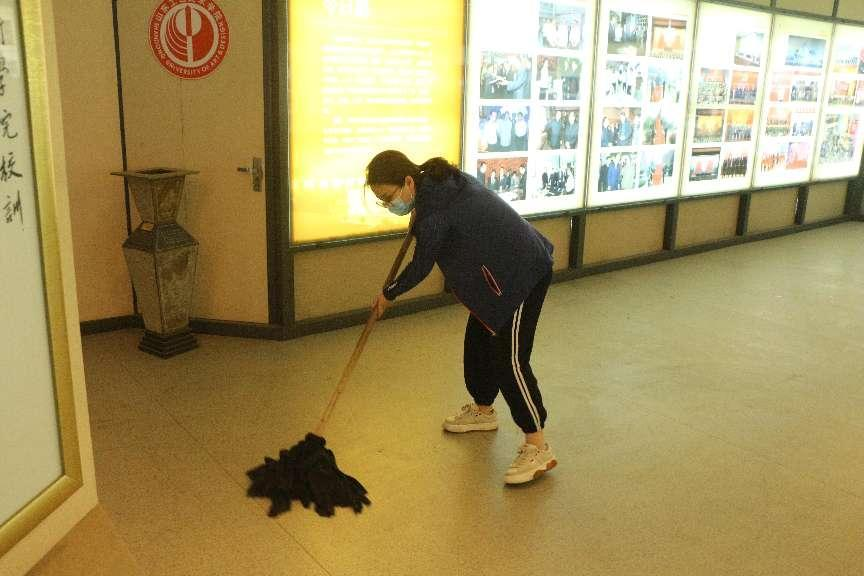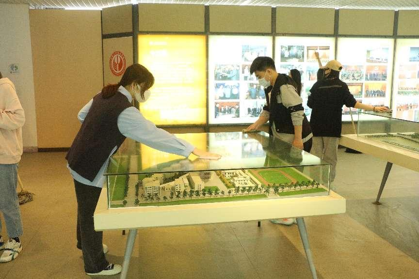 到达校史馆后,活动成员根据分工,有的扫地、有的拖地、有的擦拭展柜、有的清理楼梯,三名教工党员也参与其中,大家干的热火朝天,很快拭去浮尘,令展厅更加光亮。劳动结束后,党总支书记王玉杰带领同学们参观校史馆,亲自为大家讲解学校的每段历史,使在场人员对学校创建、发展有了较为全面、生动的认识,发自内心的感受到学校发展的光辉历程,并从一大批优秀校友的事迹上得到了极大的鼓舞。