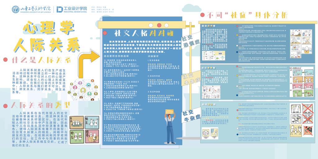 我院心理健康展板以“人际关系”为主题,解释了人际关系的定义以及学生中常见的几种人际关系类型;基于每个人是独特的个体,有不同的性格特点,在人际关系上有不用的处理方式,因此展板在设计上增加了社交人格的趣味测试,以此“对症下药”。同时,学生在文字基础上,动手绘制了与文字对应的简笔漫画,以提高观看者的阅读兴趣,达到缓解当代大学生在人际交往方面的焦虑,用科学办法处理人际关系问题的初衷。