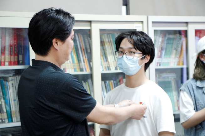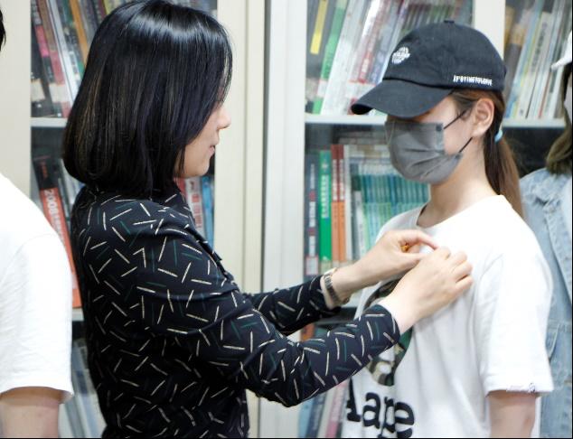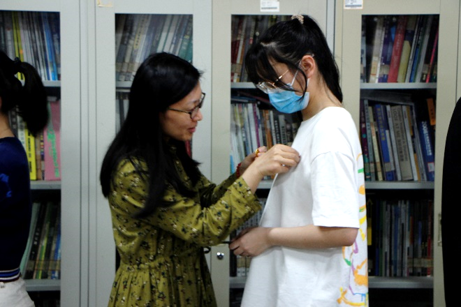 徐帅宣读了新团员的名单,张焱、韩丽达、徐帅、王艳、韩卫萍、王君秋为新团员颁发团员证并佩戴团徽。