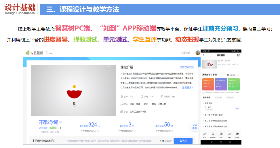 《设计基础》为线上线下混合通识课程,6学分,96学时。该课程包括线上理论讲授、课下调研与实践、课堂互动三大教学模块。线上教学主要依托智慧树PC端、“知到”APP移动端等教学平台,保证学生课前充分预习,课内自主学习;并利用线上平台的进度督导、弹题测试、单元测试、学生互评等功能,动态把握学生对知识点的掌握。线下见面课主要依托教室,完成互动答疑、实践作业汇报与作业点评等环节;也在博物馆、美术馆、艺术中心等开展现场教学。通过多层次、立体化的课程教学,使学生真正做到听得进、学得会、记得牢、勤思考,完成从知识学习、到实践训练,再到能力内化的学习过程。