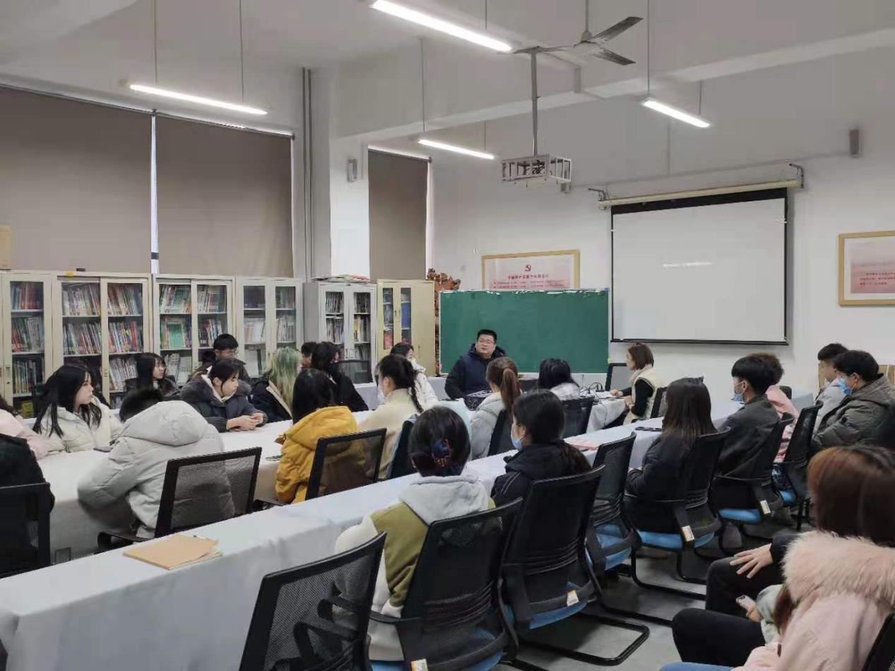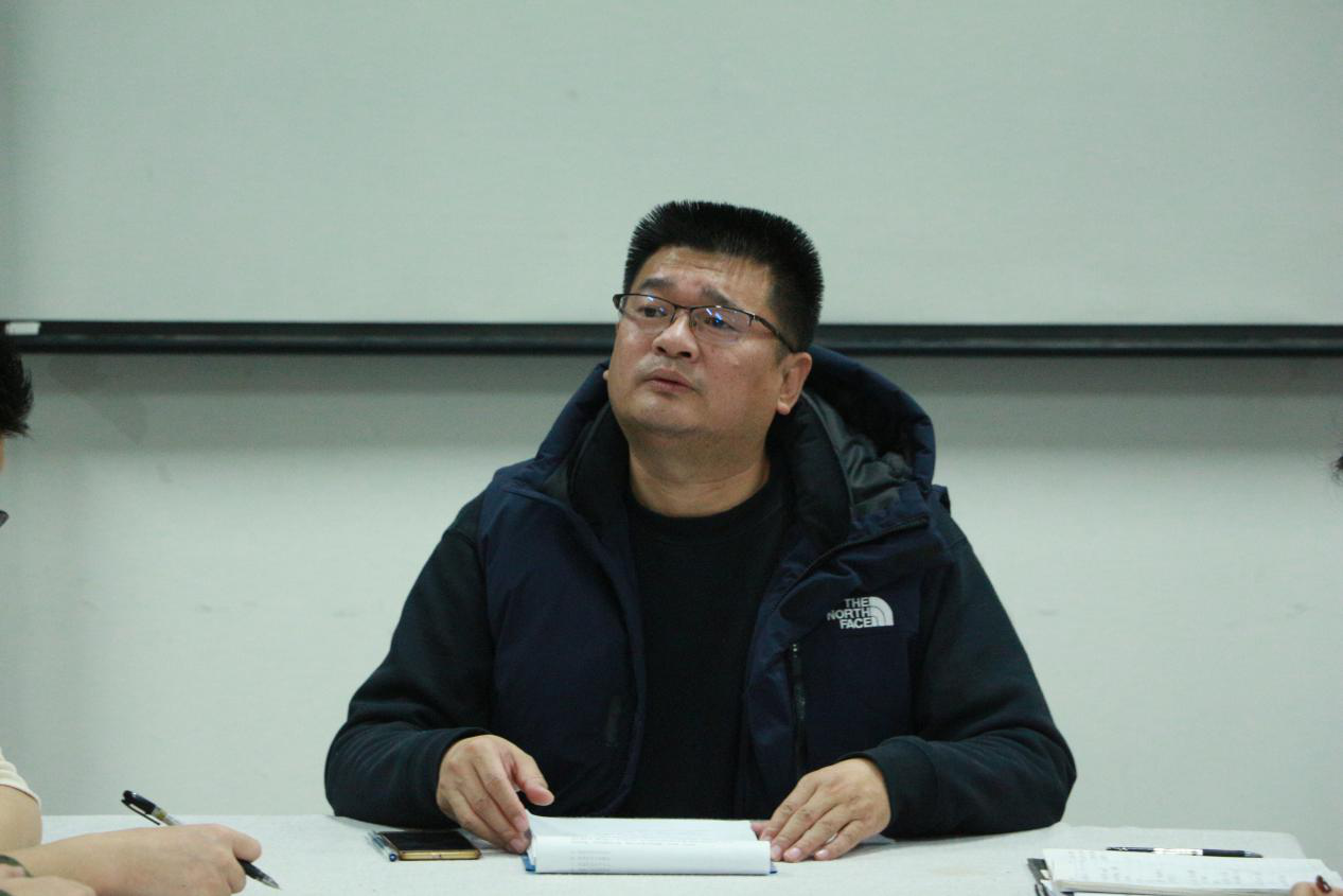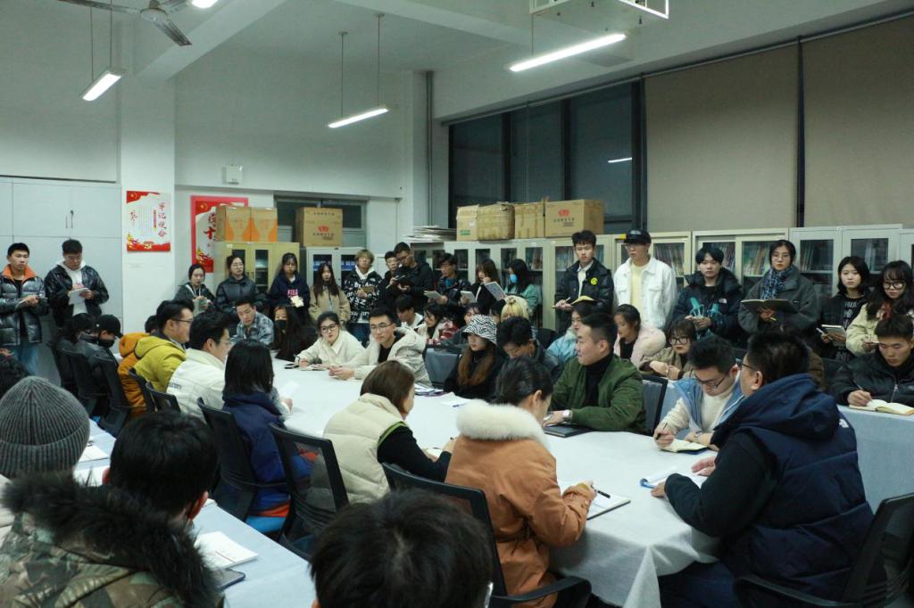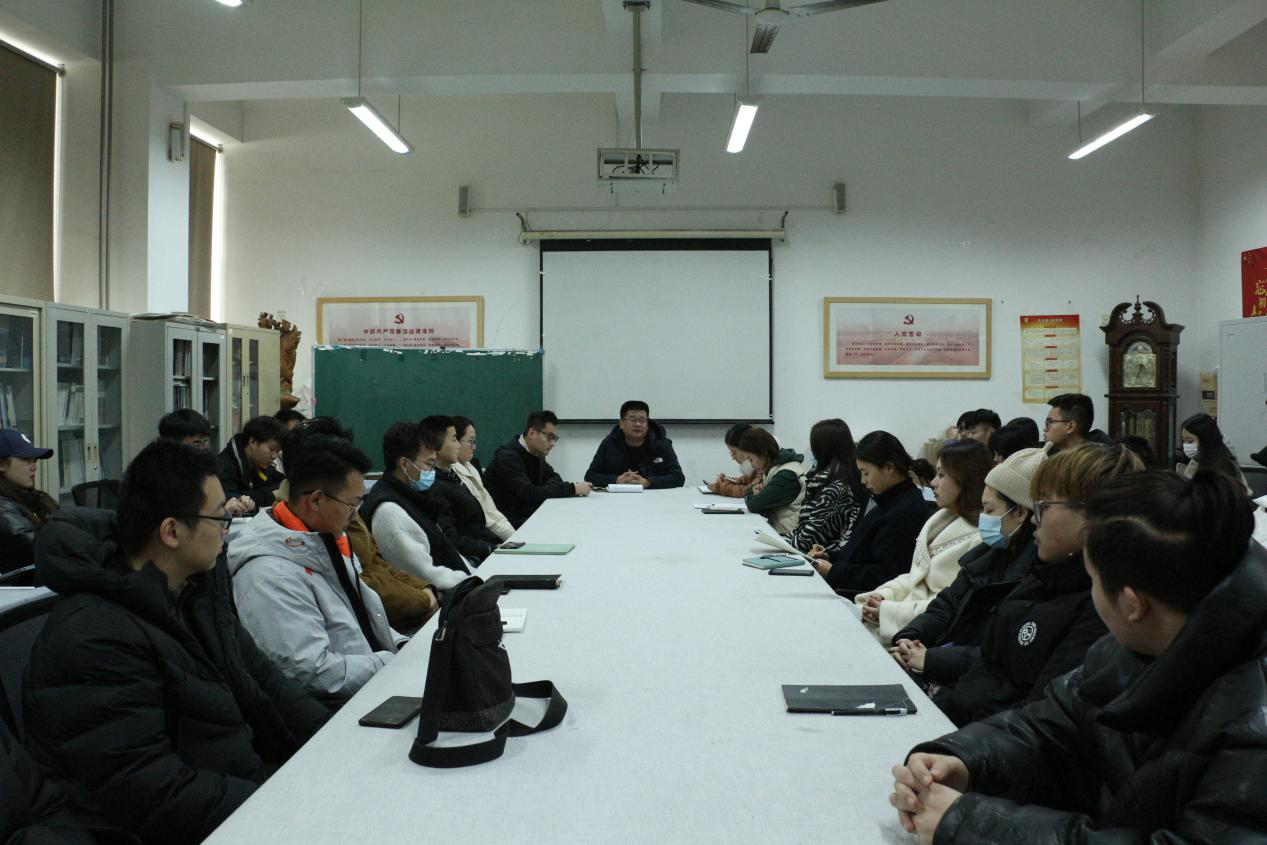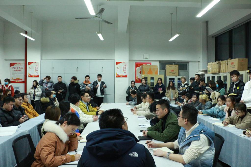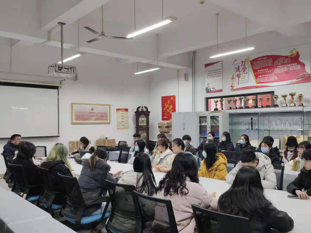 12月21日,党总支副书记姬升果、学生第二党支部书记徐帅、学生第一党支部书记李训一、辅导员李鑫与各年级全体班长团支书座谈