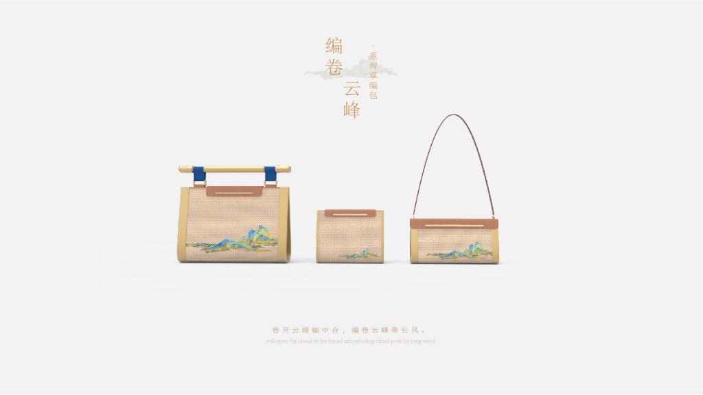 该作品以中国古典青绿山水图为主要元素,在草编包面采用刺绣工艺意象化处理了云峰山的山形,将中国古韵水墨与草编材质巧妙融合,包型灵感则源自中国的古书卷展开闭合的形态方式,从而表达出对草编这一拥有七千多年历史的非遗文化的致敬。