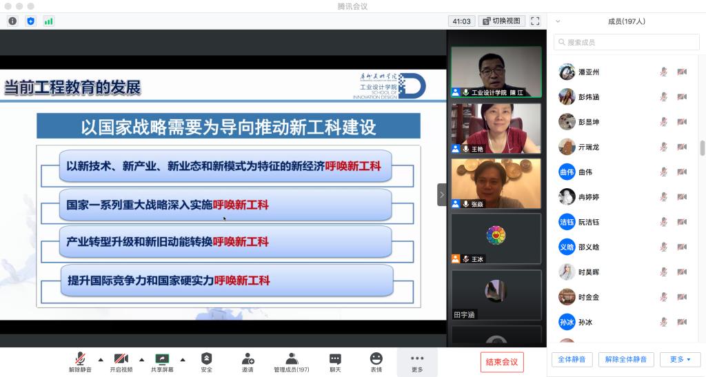 7月1日,工业设计学院邀请广州美术学院工业设计学院院长陈江教授,为本院师生作题为“新业态下工业设计专业创新人才素质的构建”的专题讲座。受疫情影响,讲座在腾讯会议上进行。本次讲座由工业设计学院副院长张焱主持,产品教研室主任王艳副教授、王冰老师,以及两百多名本科生参加了本次讲座。