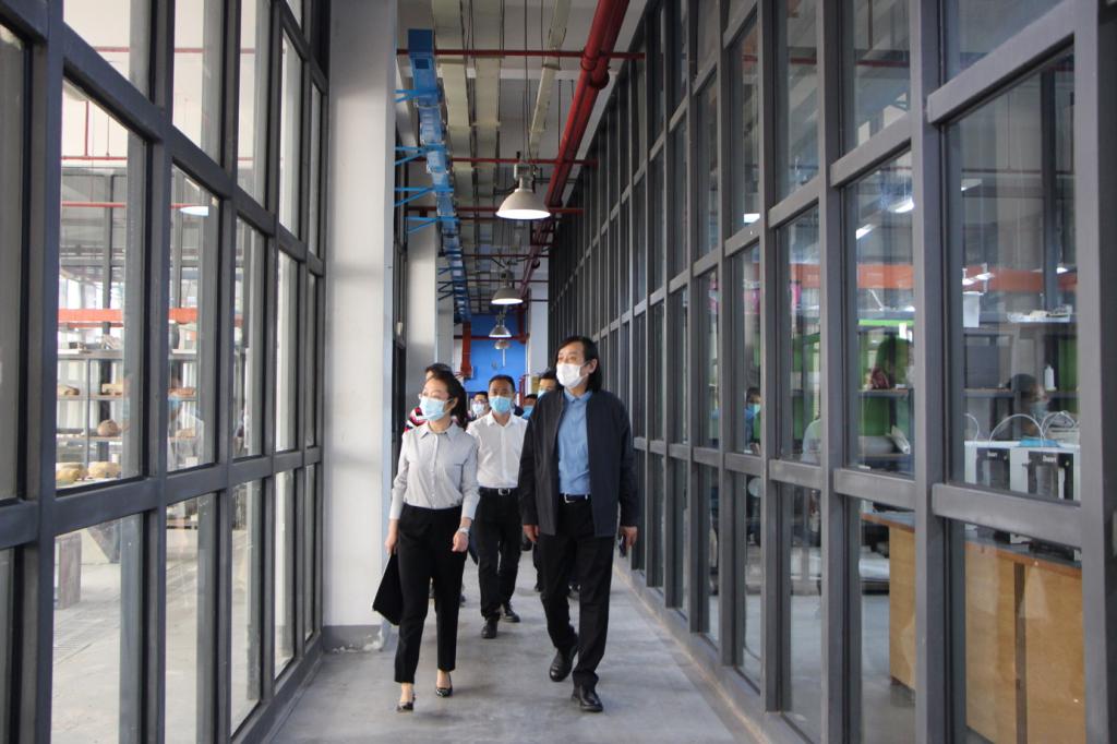 王冲鶄一行先调研了国家产教融合项目建设工地、学校美术馆、民艺馆、孙长林艺术馆和工业设计实验中心。调研过程中,苗登宇介绍了产教融合项目基地的建设情况及发展规划,美术馆、民艺馆和孙长林艺术馆藏品,以及工业设计实验中心现有实验室和实践资源和使用现状。