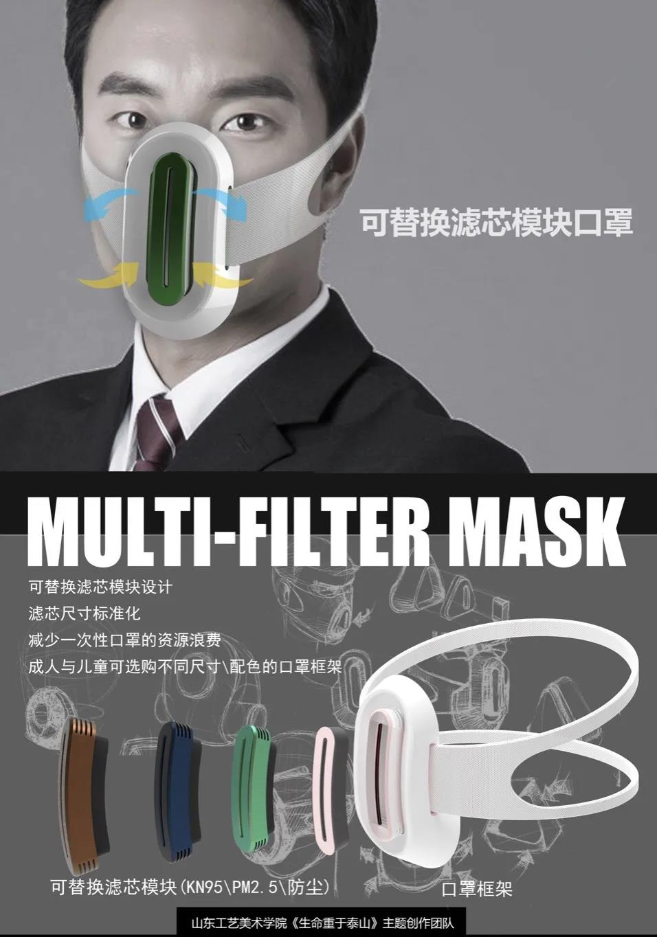 涌现了很多现实且具有针对性的优秀创意作品,如基于可持续化理念的“可替换滤芯模块口罩”,在本次新型冠状病毒的防疫、抗疫过程中,各类一次性医用防菌口罩发挥了巨大的作用,需求量增长的同时,物资供应短缺,大众缺少基本的防护条件。运用可持续化设计理念与产品模块化设计方法,设计一款可替换滤芯模块的口罩,使其可以成为家庭日常必备防护产品之一。口罩由标准化口罩支架与各种不同功能滤芯组成。用户只需根据需要加载不同过滤功能滤芯。不同功能滤芯模块采用不同色彩进行区分,如黄色防菌滤芯、蓝色PM2.5滤芯、绿色防尘滤芯等。中心滤芯还可根据使用情况,进行滤芯使用寿命的提示,而后口罩支架可实现为不同滤芯进行消毒与清尘的功能。成人与儿童可选购不同尺寸、不同配色的口罩框架,而可替换滤芯模块则采用尺寸标准化、结构统一化设计,从而减少对于大自然的资源浪费。