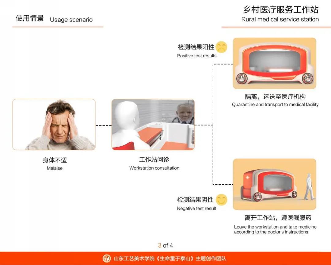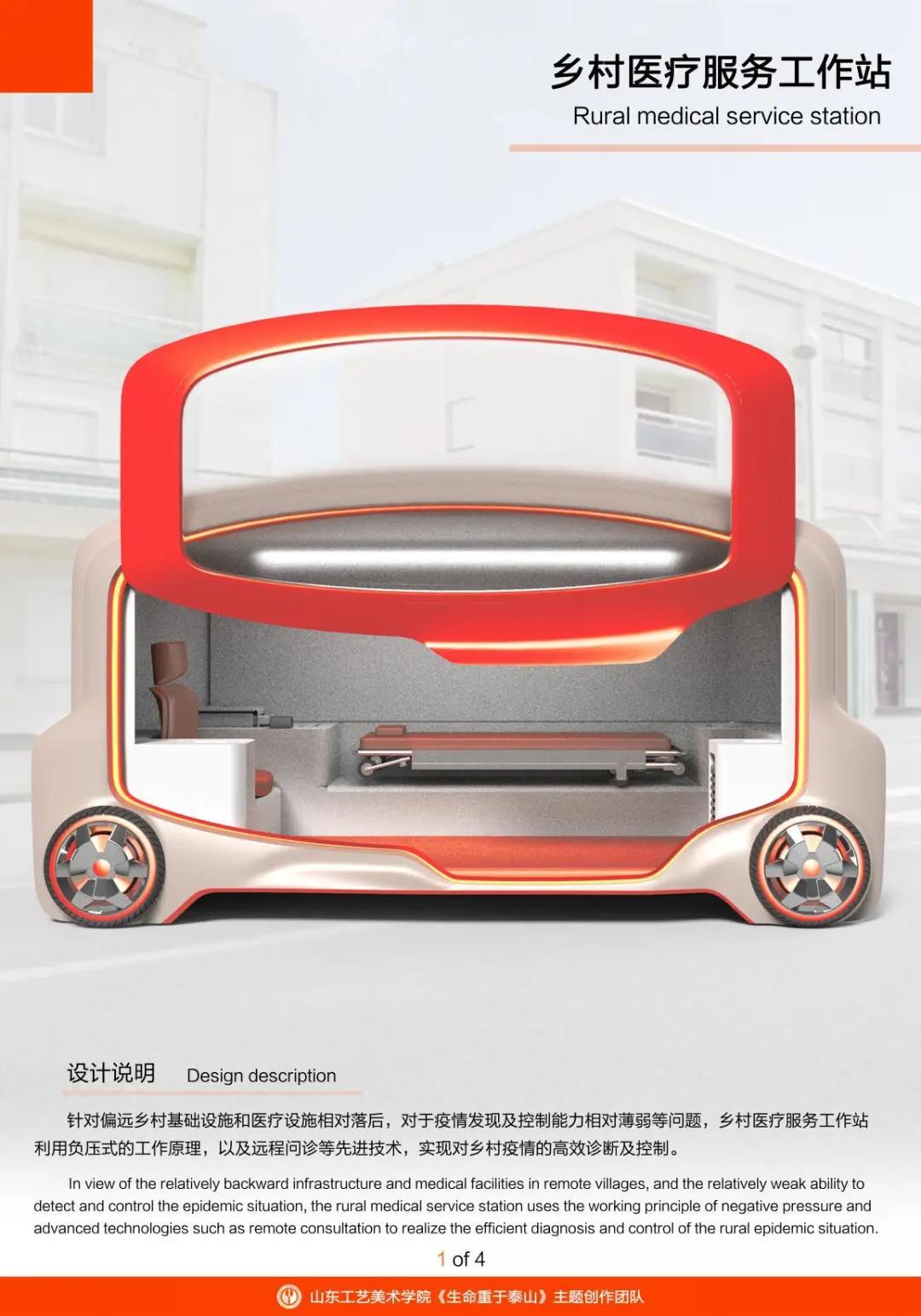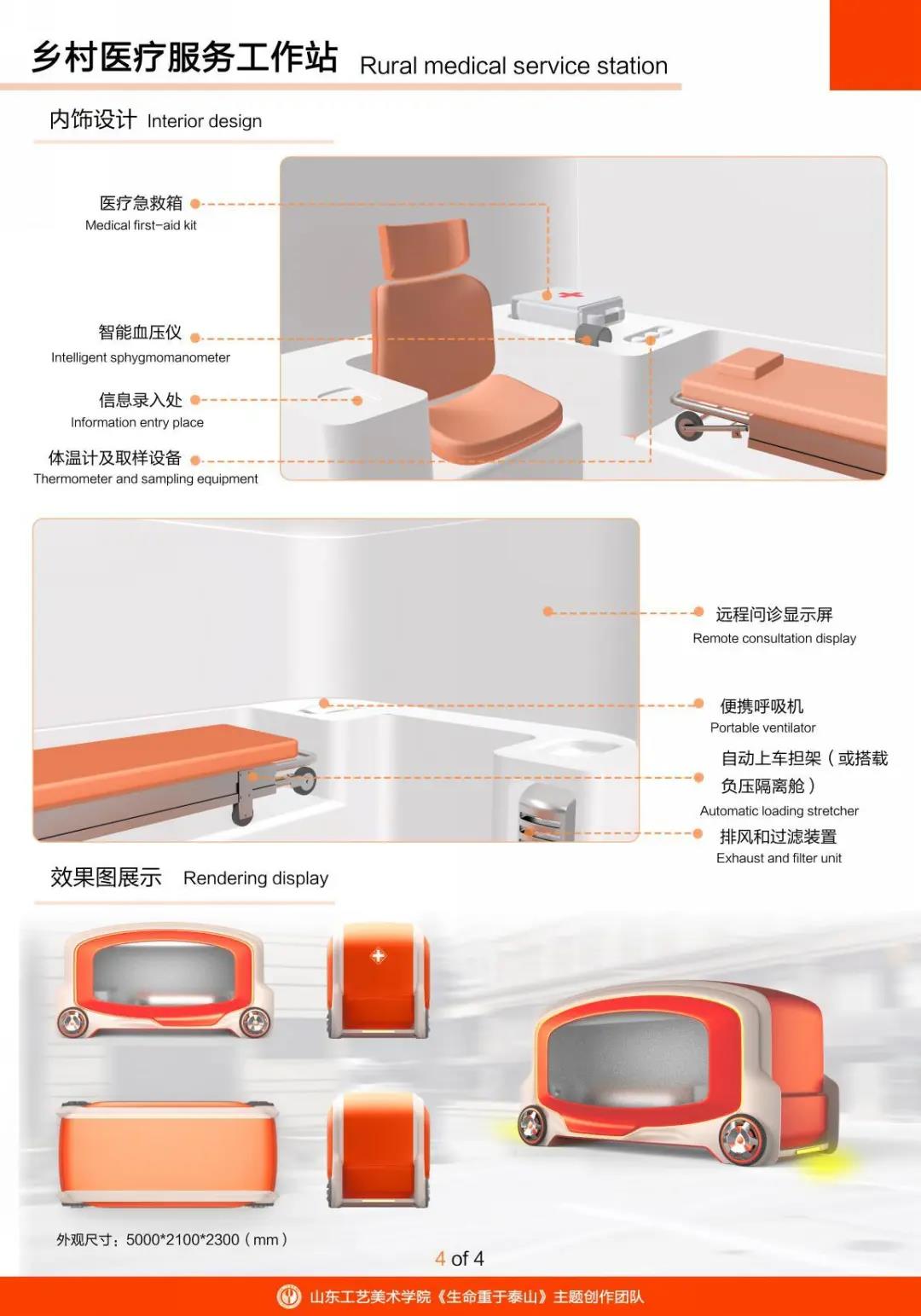 在本次主题创作中“乡村医疗移动服务工作站”设计,关注了不同空间以及群体的疫情防控方面,特别是针对交通欠发达的偏远乡村而设计。该乡村医疗移动服务工作站,造型小巧但却五脏俱全,车内可加载相关专业检测与诊疗仪器,内部还配有网络诊疗设备、基础药物。同时,还设置了负压式空气控制系统,可实现车内空气利用负压通过控制空气流动来控制病毒传播。乡村医疗移动服务工作站以例巡出诊的方式在各乡村点定期出诊,病患可通过语音问诊,实现零学习操作。普通病患通过医疗工作站问诊,即可实现获知病症、后期治疗方式建议、用药建议及基础药物领取的服务。传染病患者在被确诊后,医疗服务站内负压式空气控制系统开启,可将患者安全运送至医疗机构治疗。