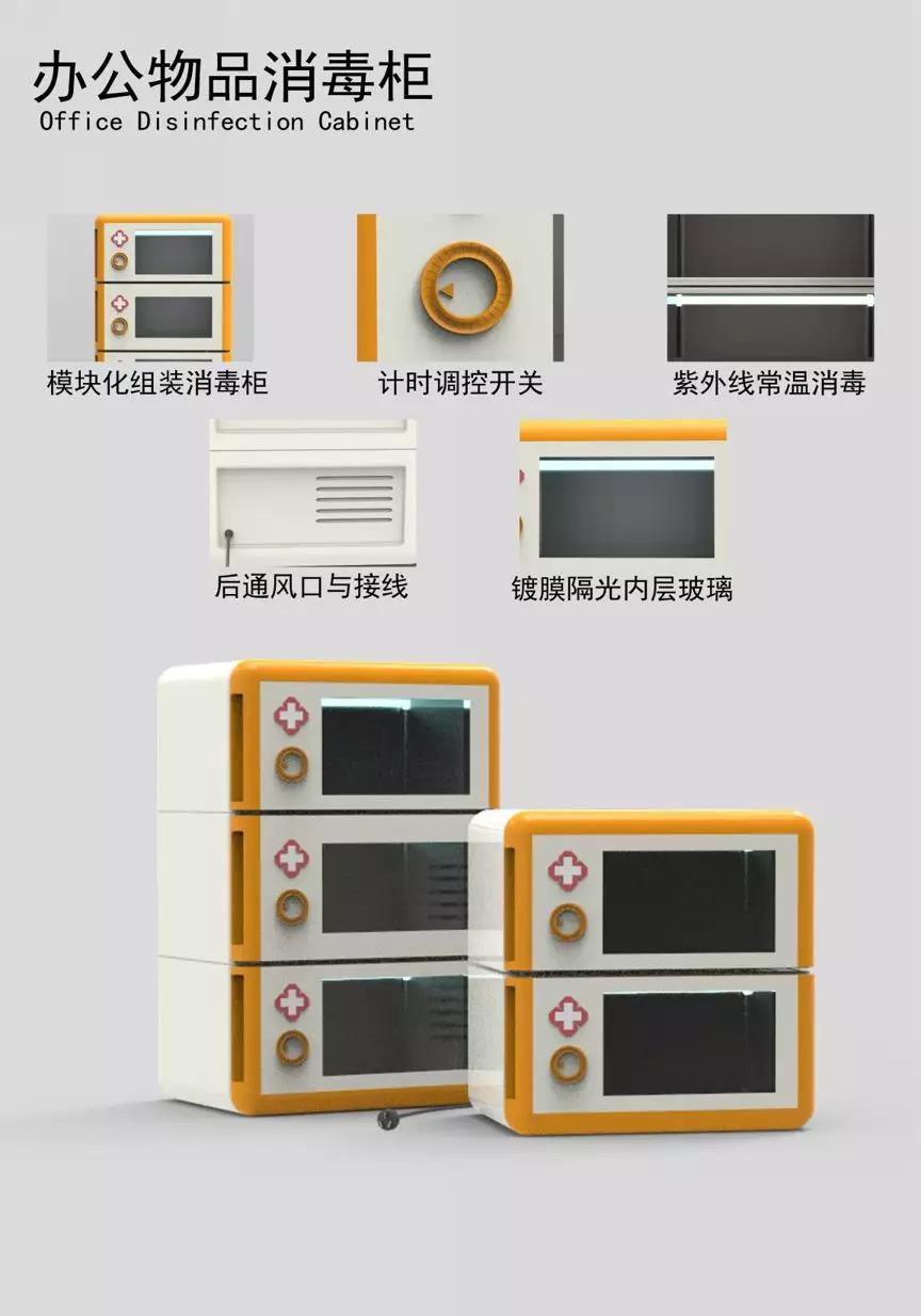 本设计旨在为给疫情暴发期间坚持工作的上班族提供一款方便实用的消毒设备。春节假期结束后,上班族回到公司工作,难免会与客人、同事交接文件,接收快递等,配备新型消毒柜,可以降低接触细菌、病毒的风险。